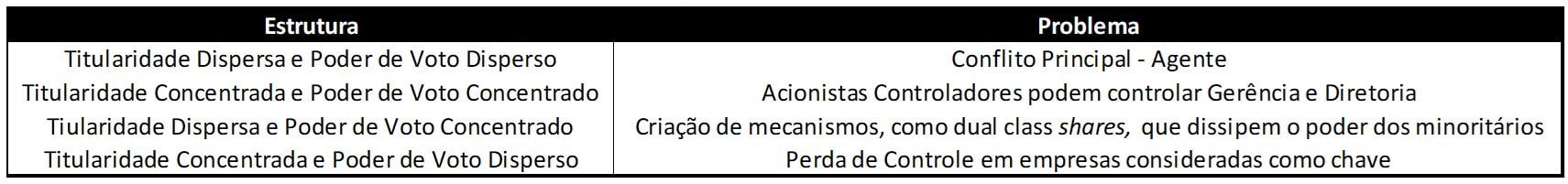 - Uma segunda estrutura é onde a titularidade é concentrada, assim como os poderes de voto. Nesta estrutura, controladores podem se beneficiar, em detrimento dos titulares minoritários.
